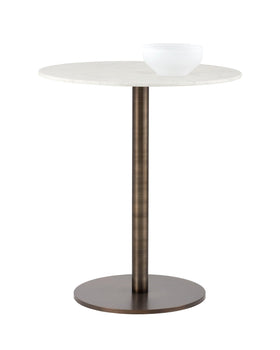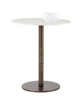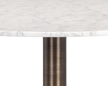 An Art Deco inspired square bar table, featuring a solid carrara marble top with an antique gold steel base. Perfect for bars, lounges and restaurants. Also available in a round version. As marble is a natural material, unique veining, pitting, fissures, micro-cracks and colour variations are all characteristics that add to the uniqueness and beauty of each piece.
