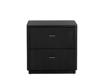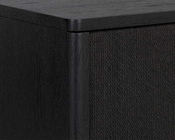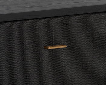 The Etienne Nightstand boasts a linear profile with a warm design. Constructed from a rustic oak veneer with solid oak wood legs and a matching rope covering on the doors. Antique brass handles complement the piece. As wood is an organic, porous material, these pieces will contain natural variation of texture and may also exhibit fine indentations and cracks. Wood pieces will also display a disparity of colour and grain, and visible knots and burls that add to the character of each piece.