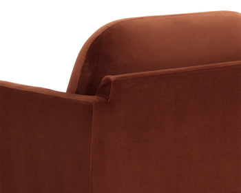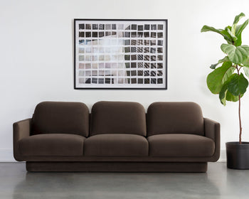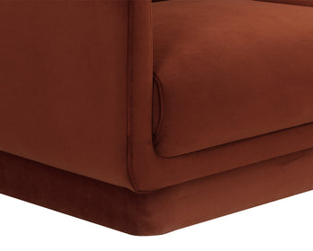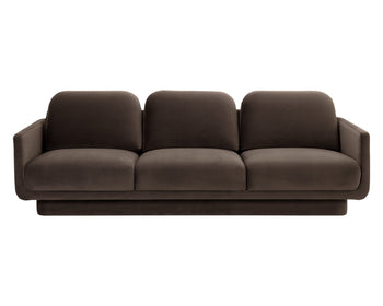 The Everton Sofa exudes classic comfort. Featuring a low profile with loose back cushions and rounded edges for a retro feel. This sofa is fully upholstered in smooth meg rust or dark brown fabric for an inviting design that will captivate in any setting.
