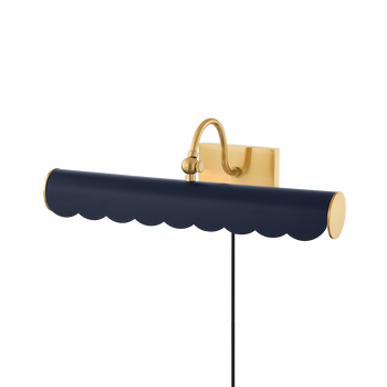 Highlight artwork, photos or other wall décor with this pretty, plug-in picture light. A new traditional take on the classic design, it features a sweet scalloped edge and curved arm that adds warmth and feels fresh. Fifi is available in three sizes and finishes; Aged Brass, Soft White, and Soft Navy to fit any space and color scheme. Part of our Ariel Okin x Mitzi Tastemakers collection.