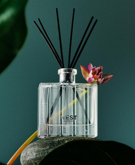 Dewy fig leaves wrapped in an aquatic veil of waterlilies evoke the cleansing feeling of a lush green forest in a downpour. Grounded in earthy woods and cooling wet stones, this Reed Diffuser encapsulates the transformative essence of rain.