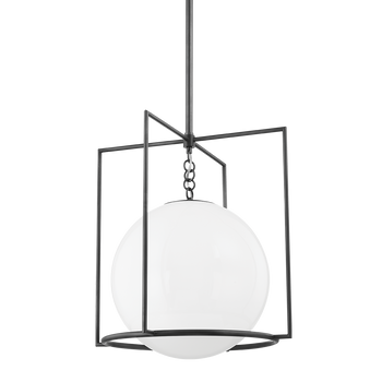 A study in contrasts, Frankie plays with positive and negative space and geometry. A large opal shiny globe hangs within a square cage of aged brass, old bronze or polished nickel. The fixture is perfectly balanced, yet fascinating to look atthe globe appears to float above the ring at the bottom. Frankie is sure to draw the eye and make a statement.