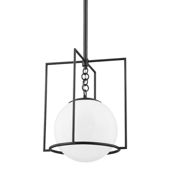 A study in contrasts, Frankie plays with positive and negative space and geometry. A large opal shiny globe hangs within a square cage of aged brass, old bronze or polished nickel. The fixture is perfectly balanced, yet fascinating to look atthe globe appears to float above the ring at the bottom. Frankie is sure to draw the eye and make a statement.