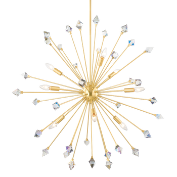 A Mid-century marvel, the sputnik style has captivated design fiends for decades. Genesis reimagines this icon, bringing celestial glamour in starburst form. Dancing between each light source are iridescent crystals, creating prisms of light throughout the room. Finished in aged brass, the Genesis Wall Sconce, Flush Mount, and Chandelier is the statement-making piece you need.