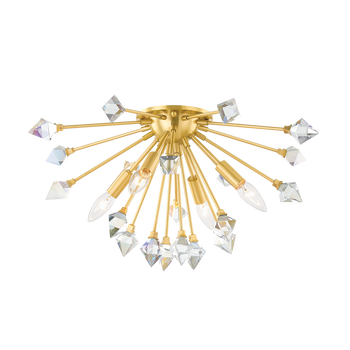 A Mid-century marvel, the sputnik style has captivated design fiends for decades. Genesis reimagines this icon, bringing celestial glamour in starburst form. Dancing between each light source are iridescent crystals, creating prisms of light throughout the room. Finished in aged brass, the Genesis Wall Sconce, Flush Mount, and Chandelier is the statement-making piece you need.