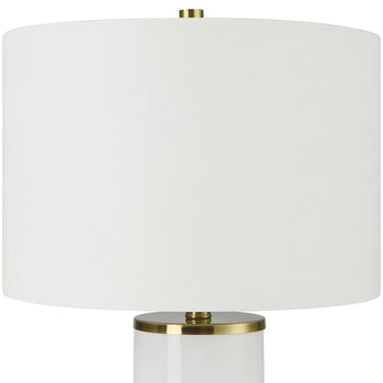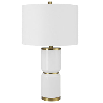 This beautiful gloss white ceramic table lamp, accented in antique gold, sits atop a metal base. A thin metal band softens the wide cylinder body. A round hardback white linen shade completes the look and makes this a perfect lamp for a nightstand or on a