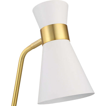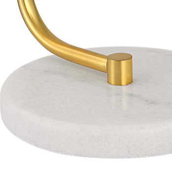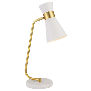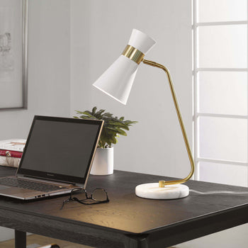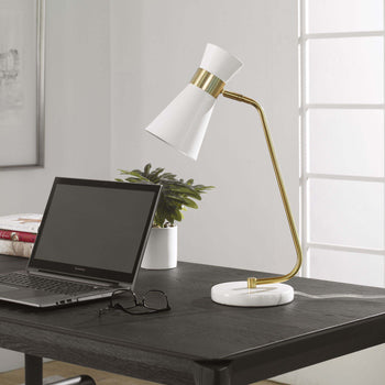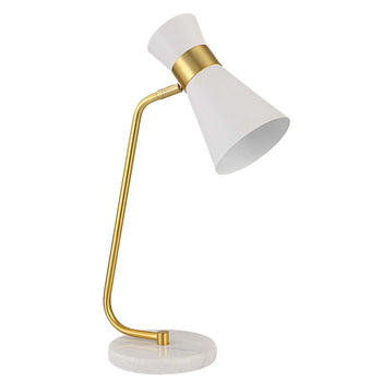 The unique design of this desk lamp will make any work space a little better. Finished in a beautiful gold, and sitting atop a white marble foot, the lamp features a metal cone like shade that pivots, allowing you to focus better on the task at hand. Also