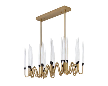 The Hestia Chandelier gives a nod to classic style. Cleverly crafted from an iron frame in a brushed gold finish. Acrylic rods sit atop the sinuous curves of the suspended fixture.