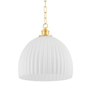 Hillary captures the cottage charm captivating the design world. The single light pendant, available in aged brass and old bronze features a fluted glass shade dangling elegantly from the chain. Stunning on its own, this antique darling proves better in pairs, layered in multiples over a kitchen island or dining scene. Also available in a smaller size.