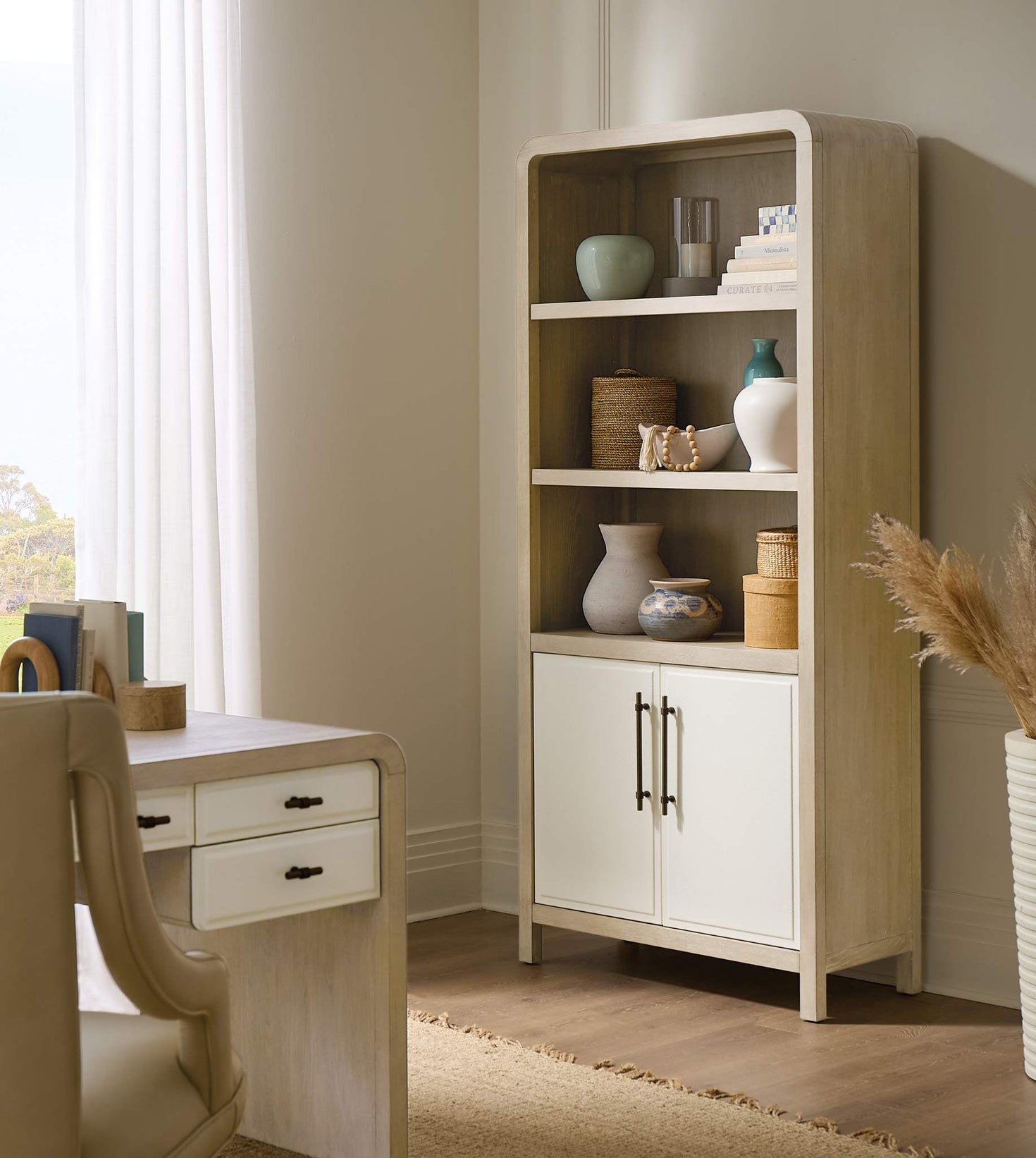 The Brixton Home Office Collection is a thoughtfully designed trio featuring elegant, curved waterfall silhouettes that give the collection a sleek and contemporary aesthetic. The two-tone finish pairs soft, elm veneers in a pebble hue with door and drawer fronts in a contrasting ivory with leathered texture.