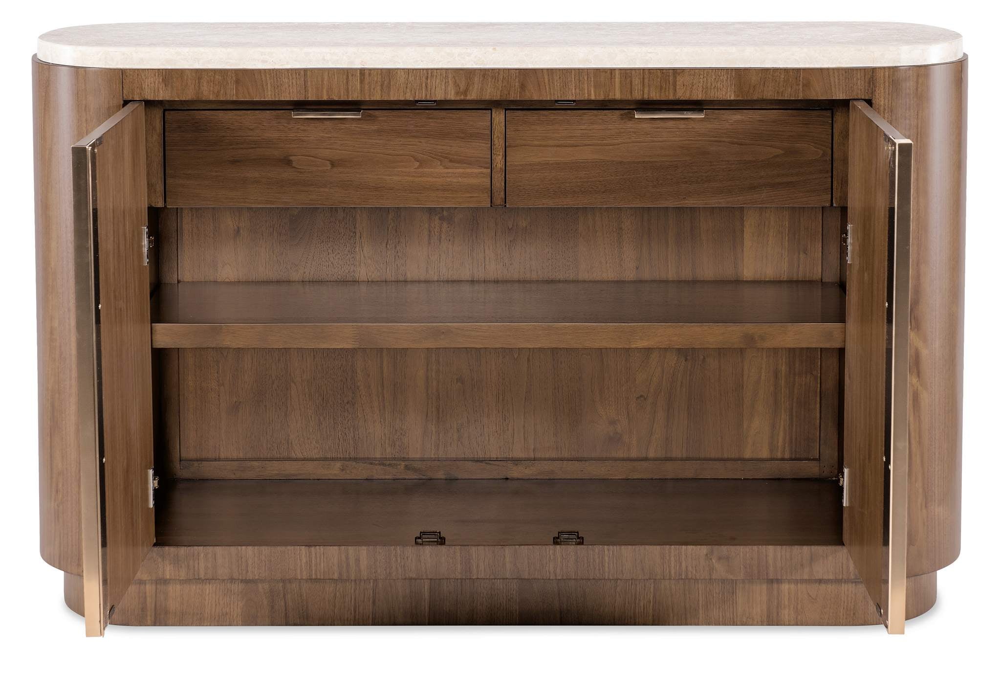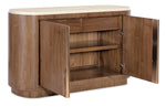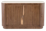 Finish: Light Caramel finish featured on split-heart and quartered walnut veneers. Marble top features white and beige coloring.