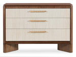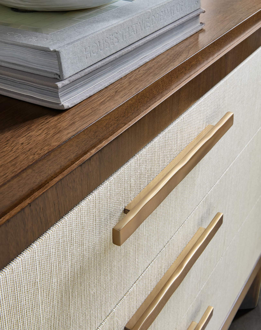 Finish: Light Caramel finish featured on split-heart and quartered walnut veneers. Grass-cloth drawer fronts with beige coloring.