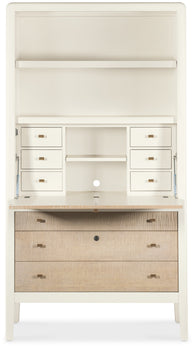 - Drop-front writing surface with 6 small drawers and one adjustable wood shelf