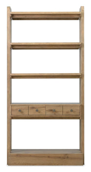 The four-piece Kalamazoo Home Office Collection evokes the look of furniture salvaged from workshops or industrial settings, featuring oak veneers in an aged finish that adds to the authenticity of each piece.