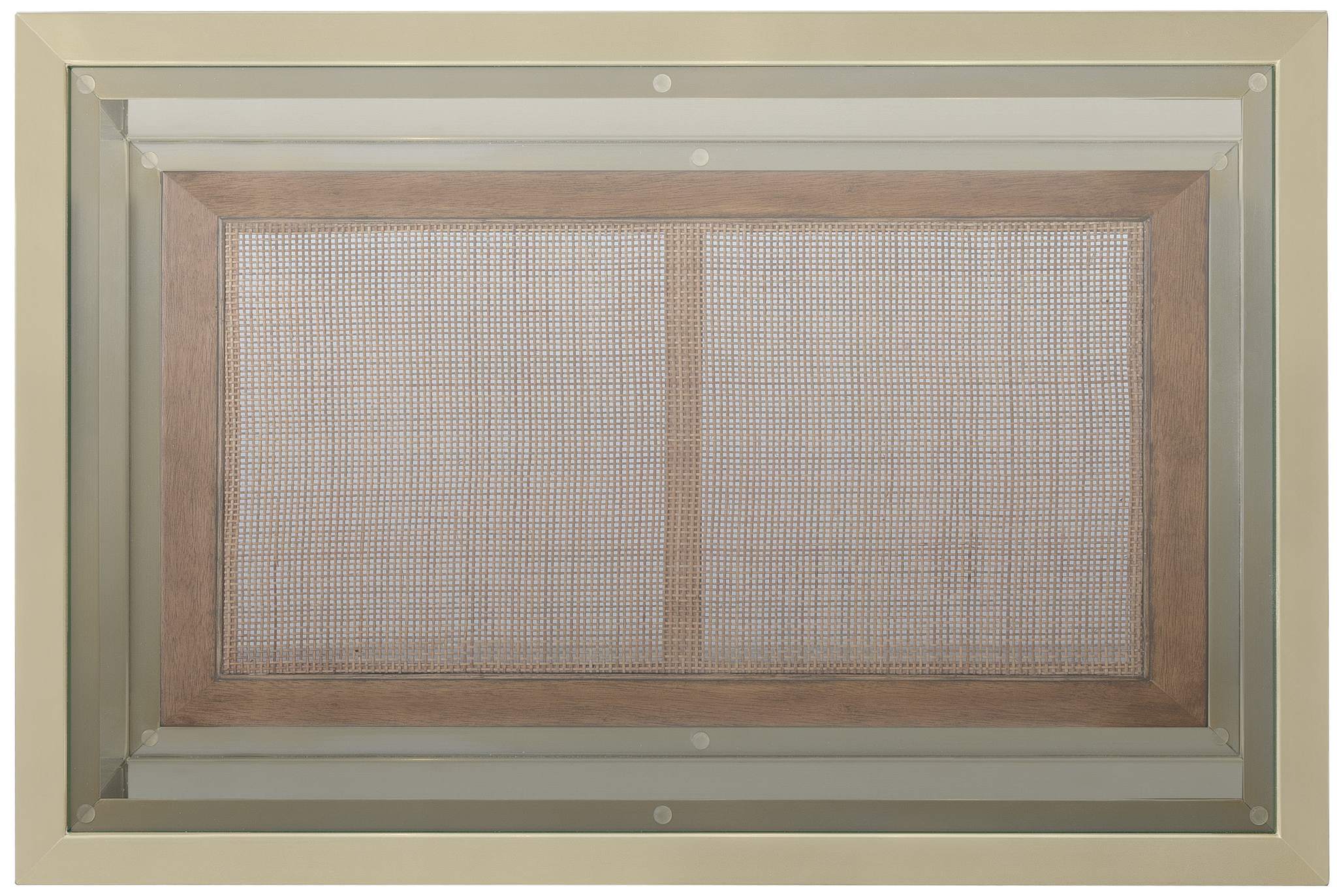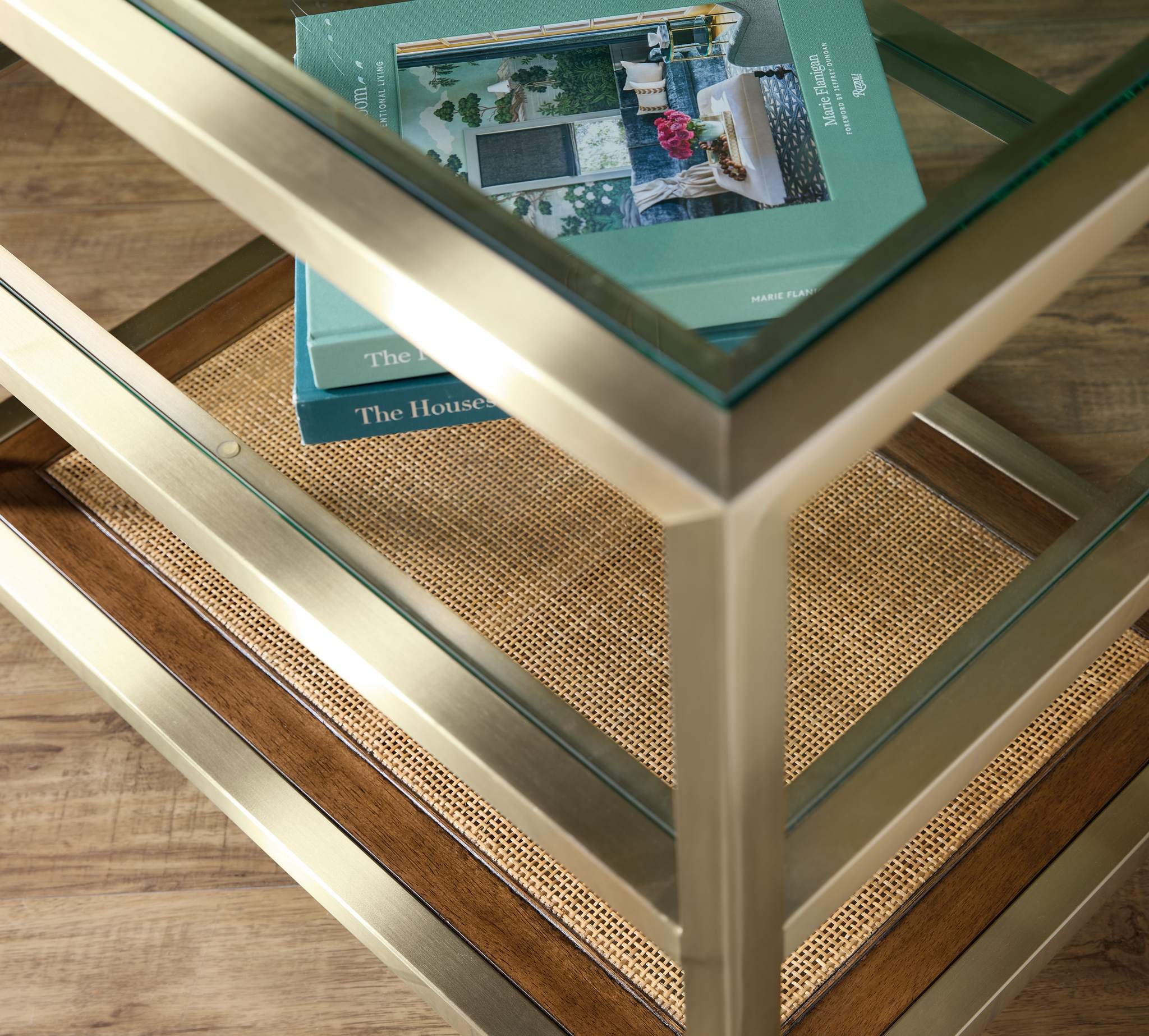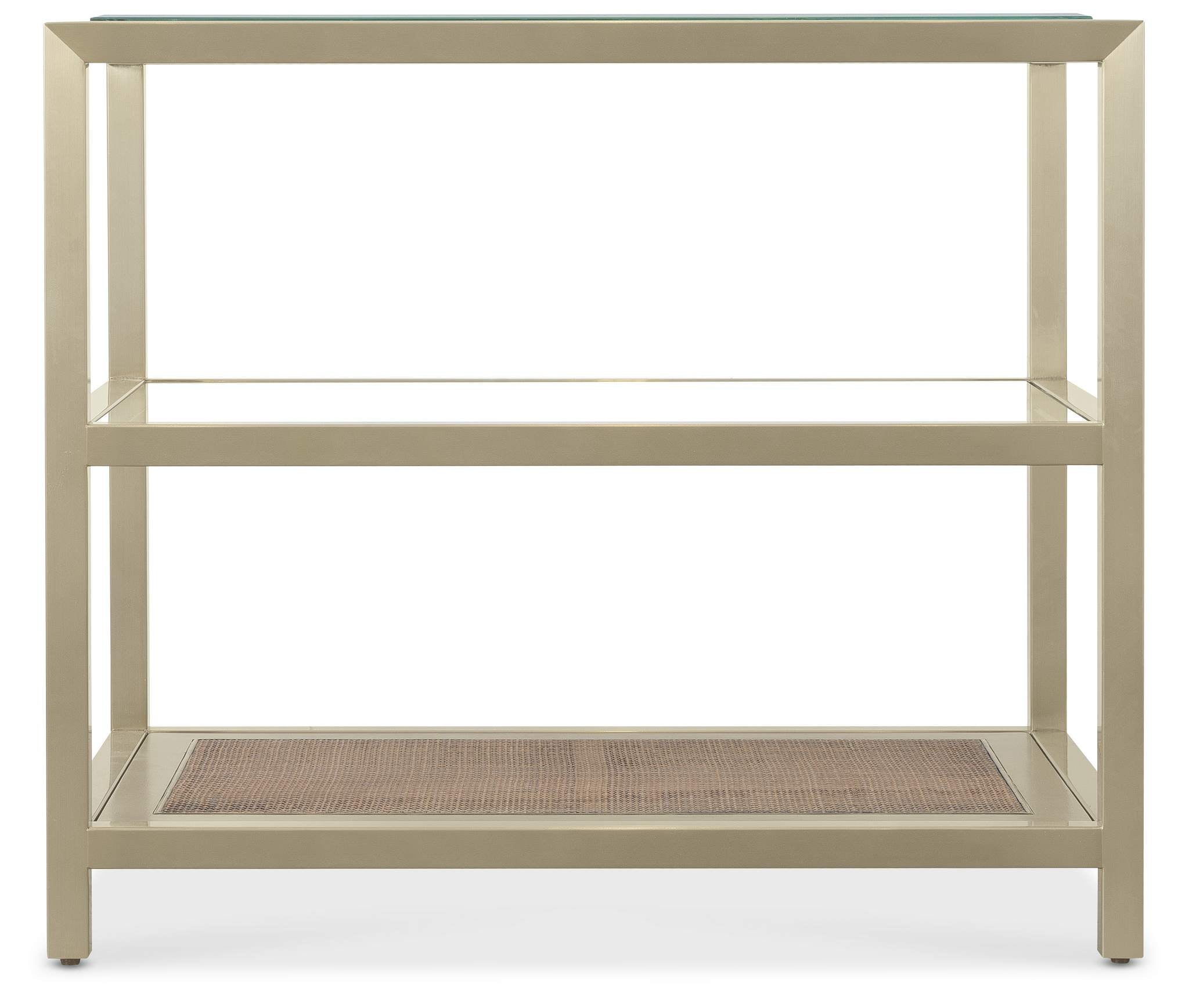 Bottom fixed wood-framed cane shelf with glass inserts