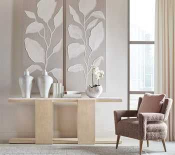 Understated and elegant, the Westwood Collection was designed for those who appreciate the finer things in life. Exuding a quiet luxury" lifestyle, Westwood seamlessly blends minimalist aesthetics with sophisticated comfort. Crafted with quartered oak veneers, the Polished Limestone finish offers a soft hand, adding character and depth to the group. Plated hardware and silver-leaf detailing adds to the soft modern appeal. Designed for those who value subtle sophistication, the whole home collection with coordinating upholstery can easily transform any space into an elegant haven of serenity and style.