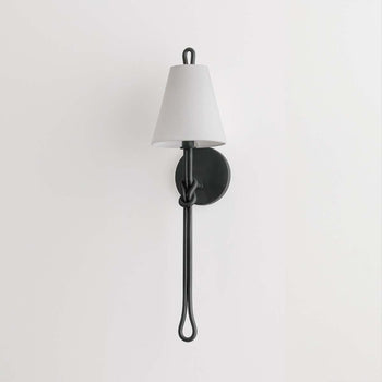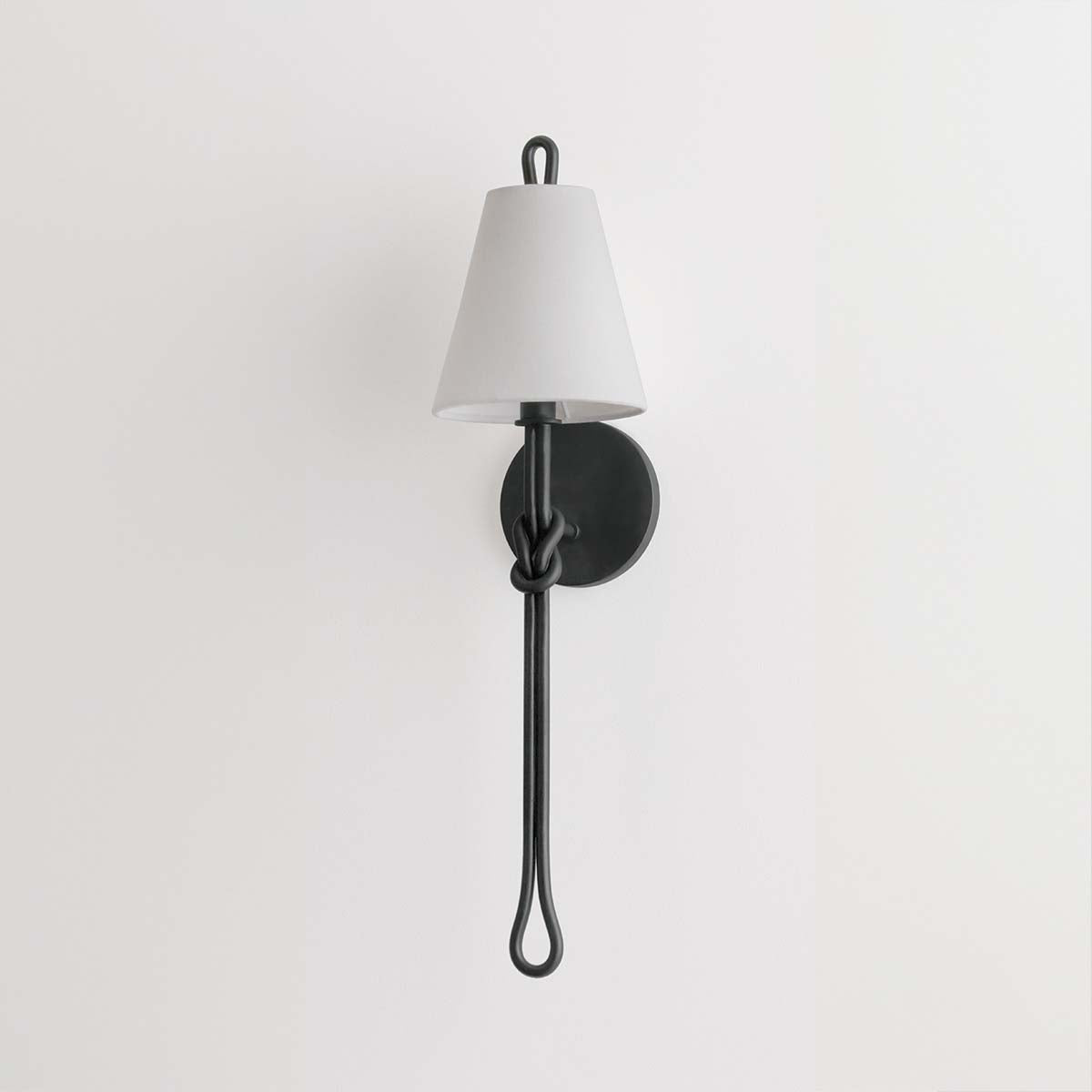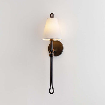 Maritime meets modern style in the Alburgh sconce. The clean single-light design features an elongated silhouette accented by a nautical square knot in the center and loop details at the top and bottom. The crisp white linen shade carries through the timeless, tailored look. Alburgh is available in luxurious Vintage Gold Leaf or a more rustic Aged Iron finish.