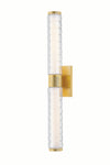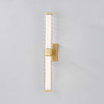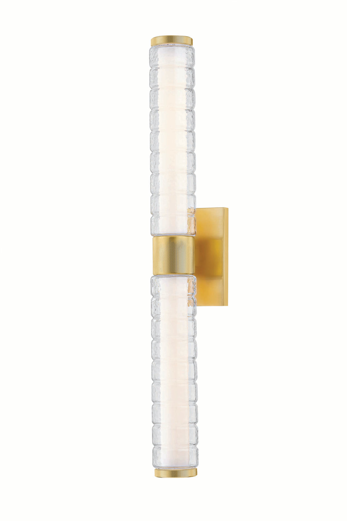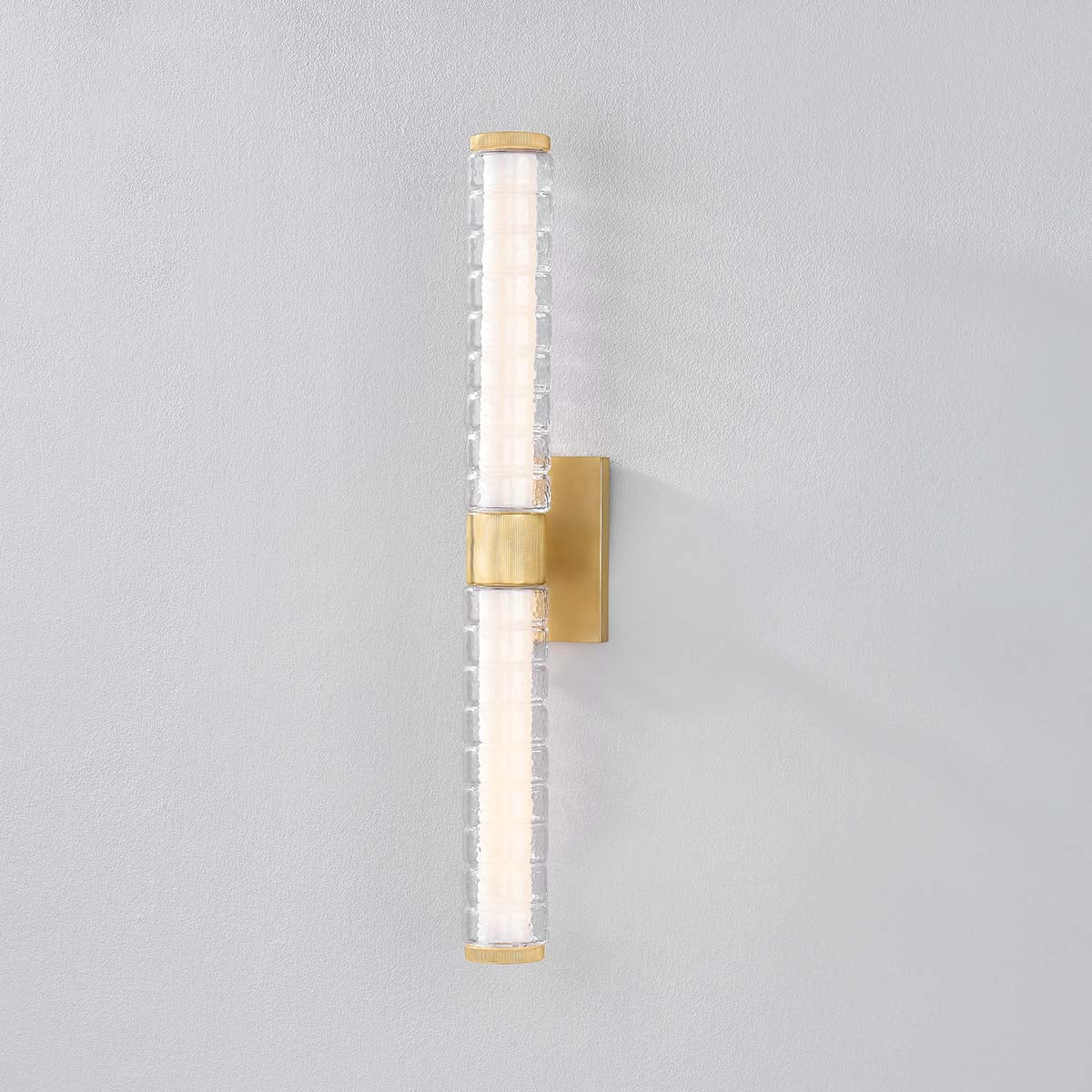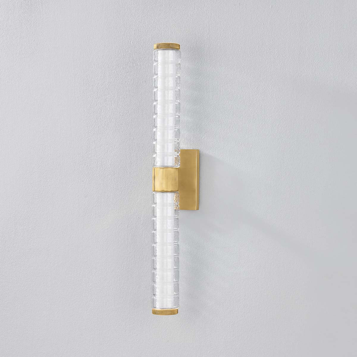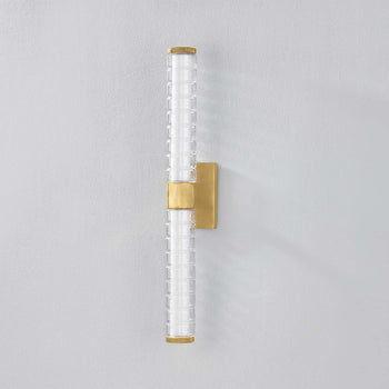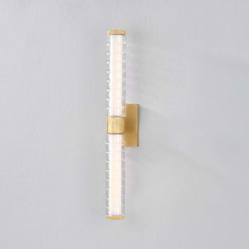 Drawing inspiration from modernized Art Deco interiors, Castor features a construction of thick glass tubes, ridged to resemble stacked rings. The subtle chill marks of the glass create a contemporary, icy glow when lit by the integrated LED. An Aged Brass finish adds warmth to the frame. Whether in its 1 or 2-light form, Castor illuminates spaces with a lively, bubbly charm.