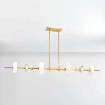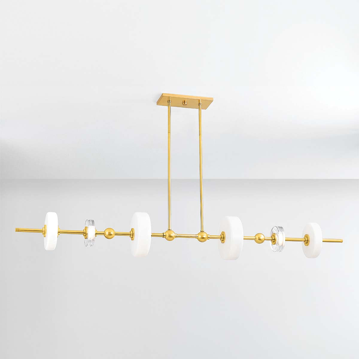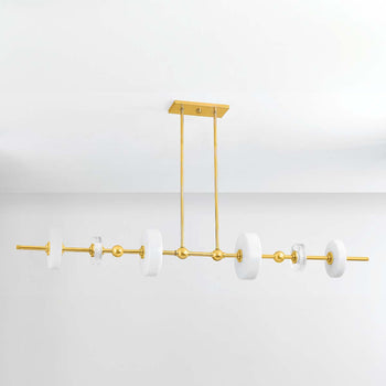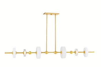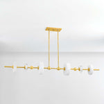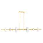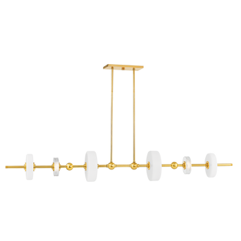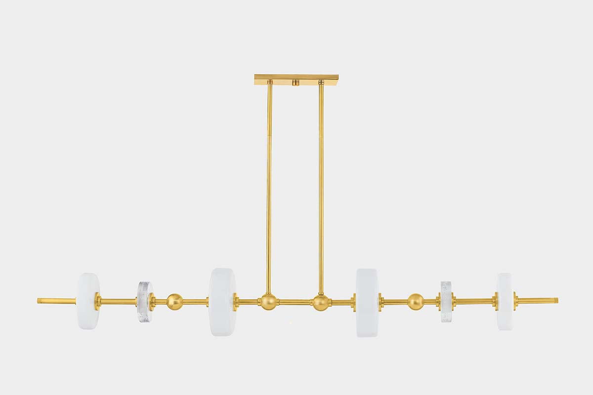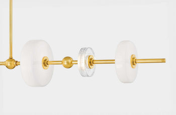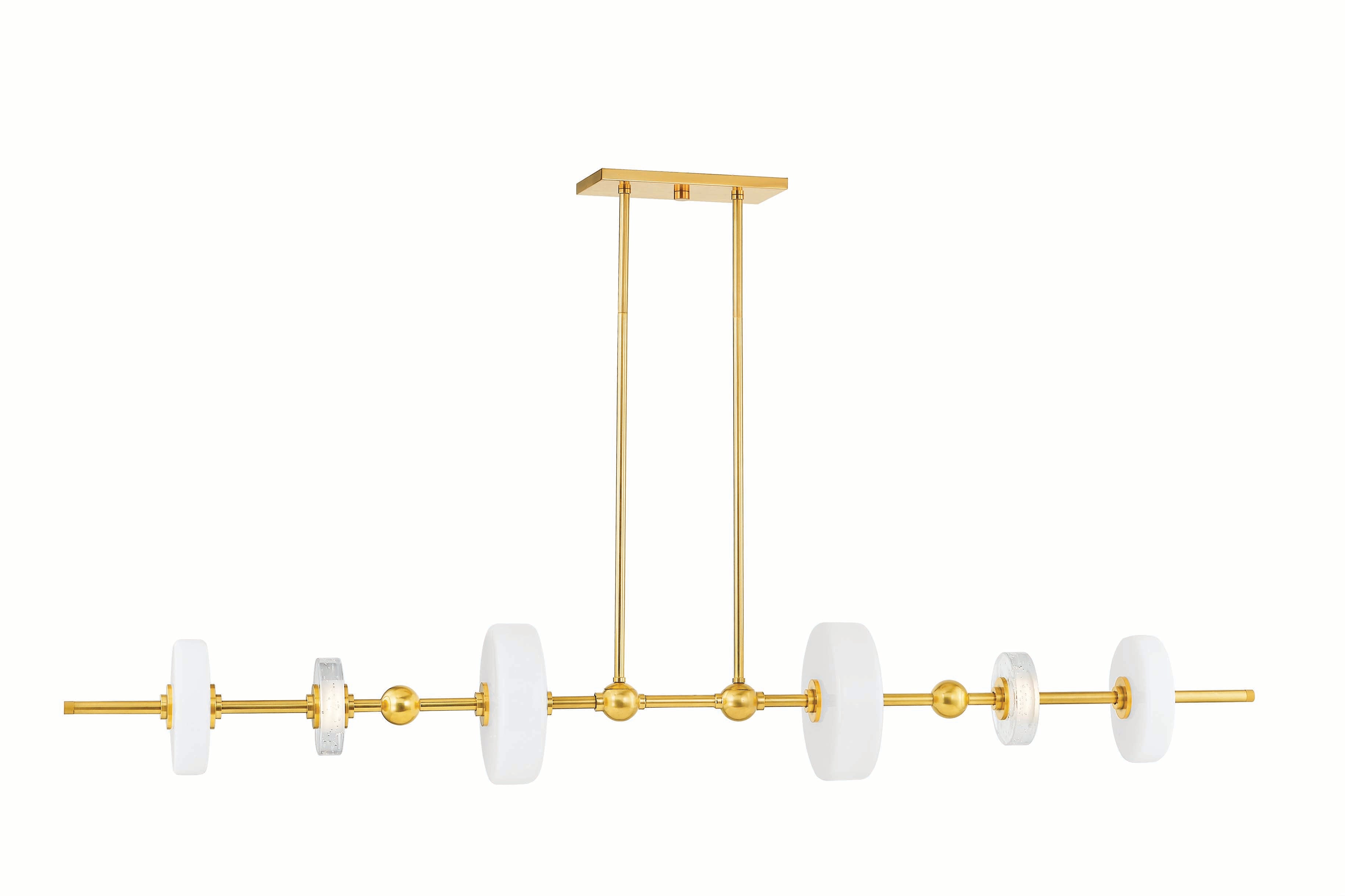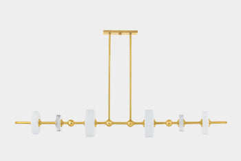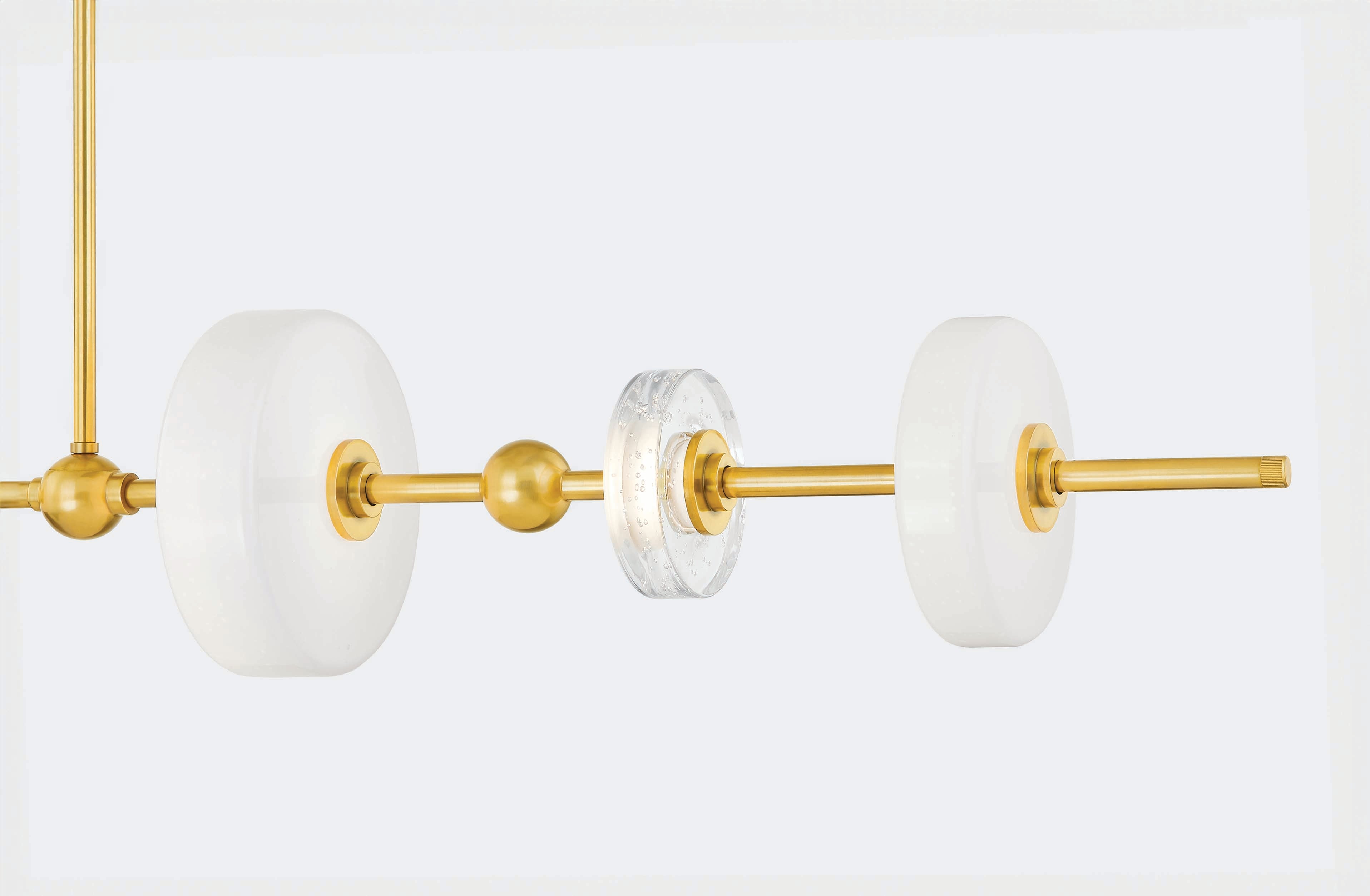 Machine precision and slim LED profiles provide a sleek update to an iconic mid-century silhouette. Glass ornaments, hand-blown from either seedy opal glass or seedy etched glass, stack in totemic formations along the slim arms of this chandelier. An Aged Brass finish elevates the fixture, balancing the playfulness with a note of luxury. Maynard is available as an 8, 12-light chandelier, 6-light linear, or a 3-light sconce.