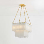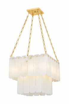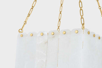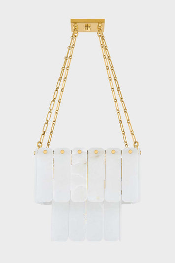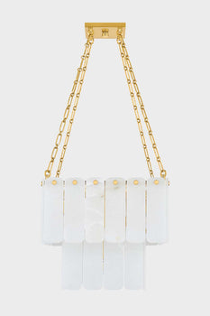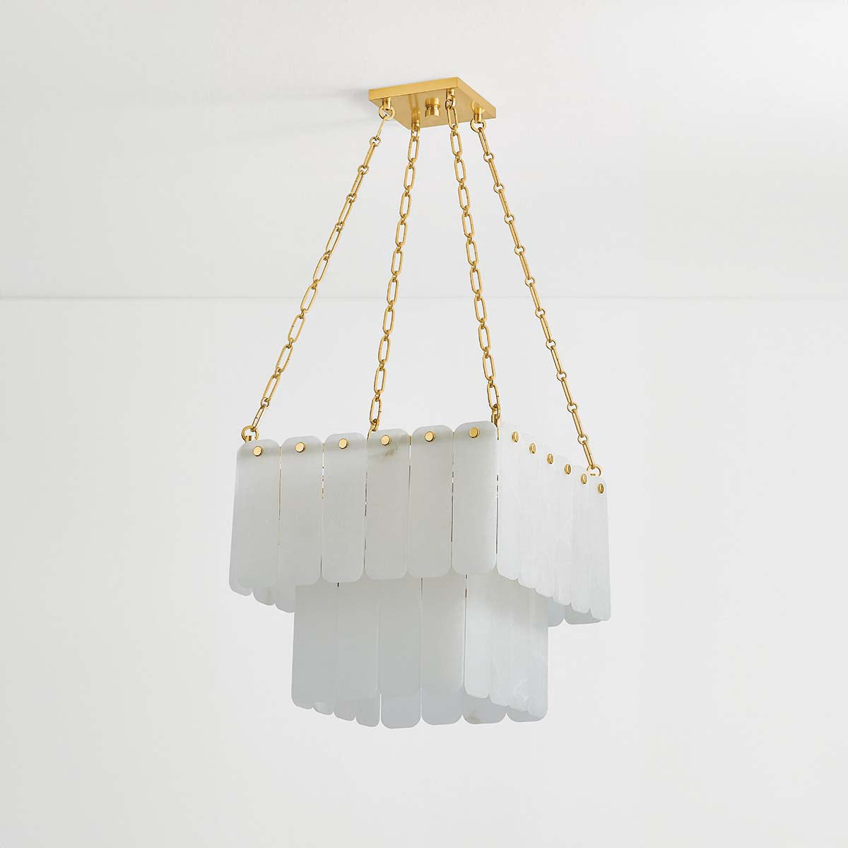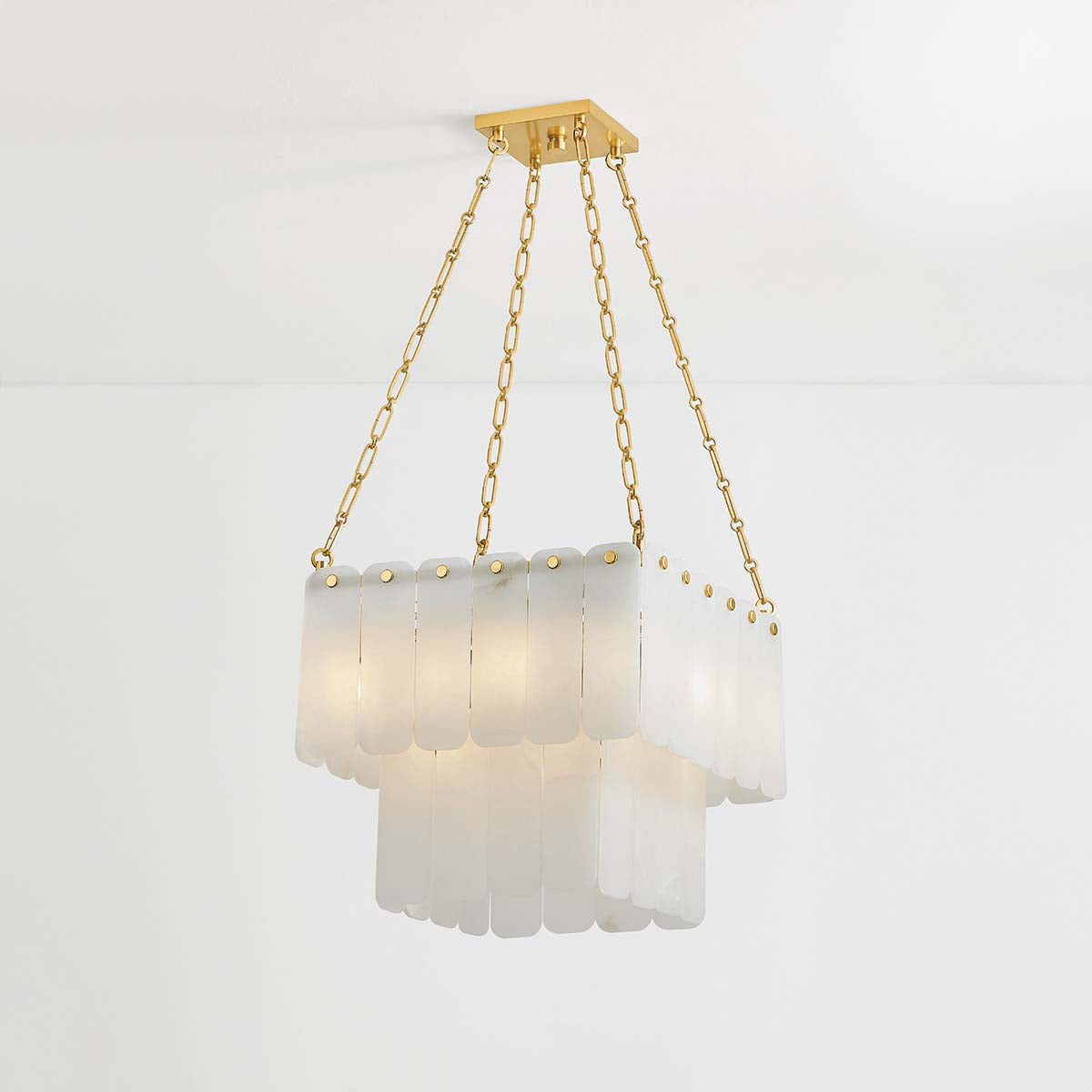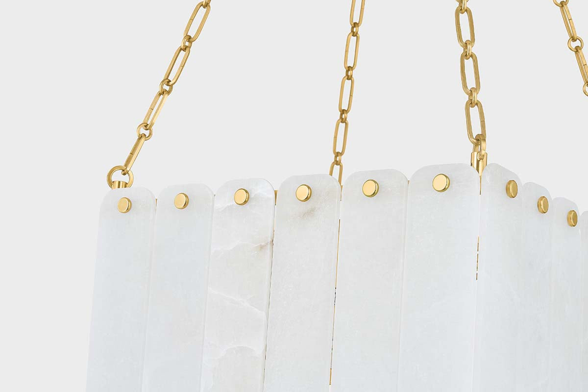 Inspired by Art Deco design, this grand chandelier features three tiers of lustrous cascading alabaster panels. Cool and milky when unlit, the subtly translucent alabaster comes to life with a warm glow when illuminated. Enhanced with Aged Brass finials and suspended from an elegant chain, Moissanite exudes an old-world sense of glamor. Choose between a 17 or 33-light option – both make a striking statement in an entryway or large living room. *Due to the one-of-a-kind nature of the medium, exact colors and patterns may vary slightly from the image shown.