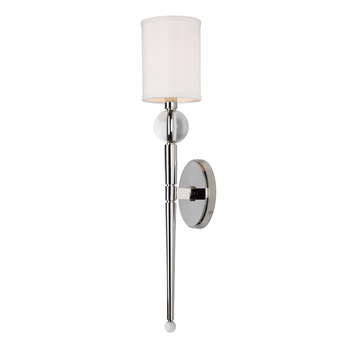 Topped by a soft-white fabric shade, the tapered wand of the Rockland sconce showcases the glamour of shining crystal orbs. While the Polished Nickel finish projects a mirror-like shine, its warm tone complements the shade's soft hue.,Topped by a soft-white fabric shade, the tapered wand of the Rockland sconce showcases the glamour of shining crystal orbs. While the Polished Nickel finish projects a mirror-like shine, its warm tone complements the shade's soft hue.