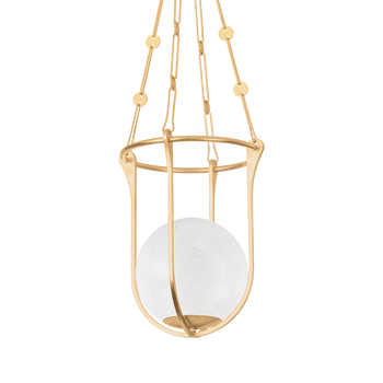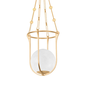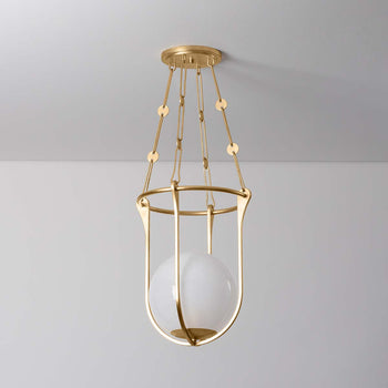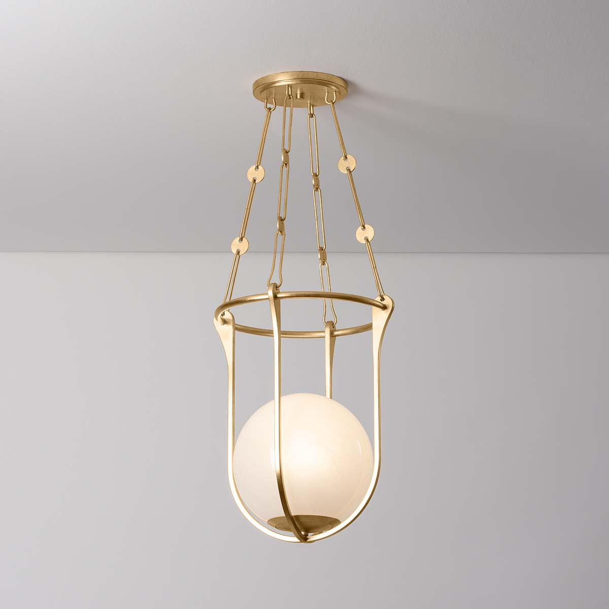 A delicate Vintage Gold Leaf cage, gracefully swirling cloud glass orb and intricate suspension chains converge to create this mesmerizing pendant light. Exhibiting a jewelry-like appearance, Verbank is enhanced by its subtle details, including circular ornaments on the chains and Art Deco-inspired curves. Like a planetary body glowing in the sky, this is a truly magical lighting experience.