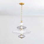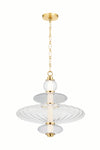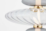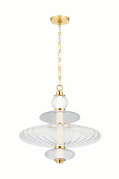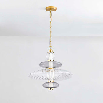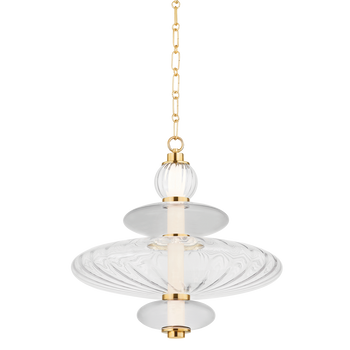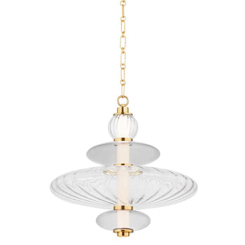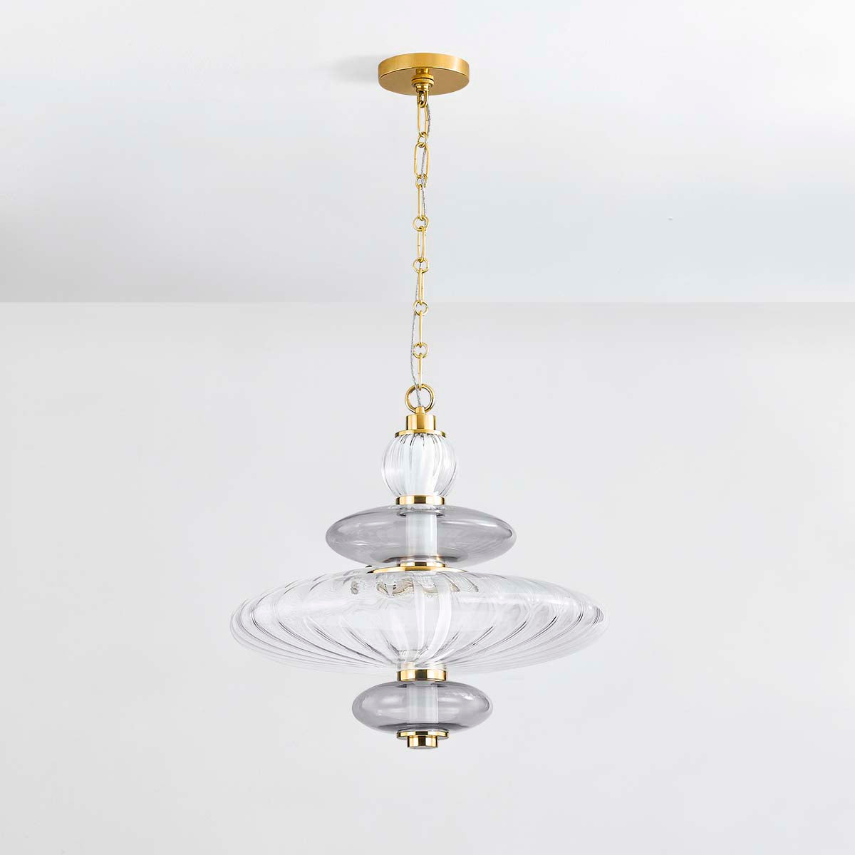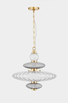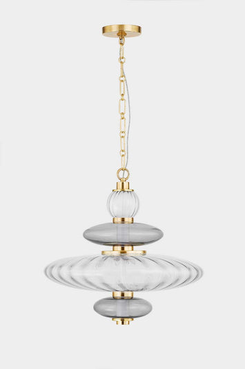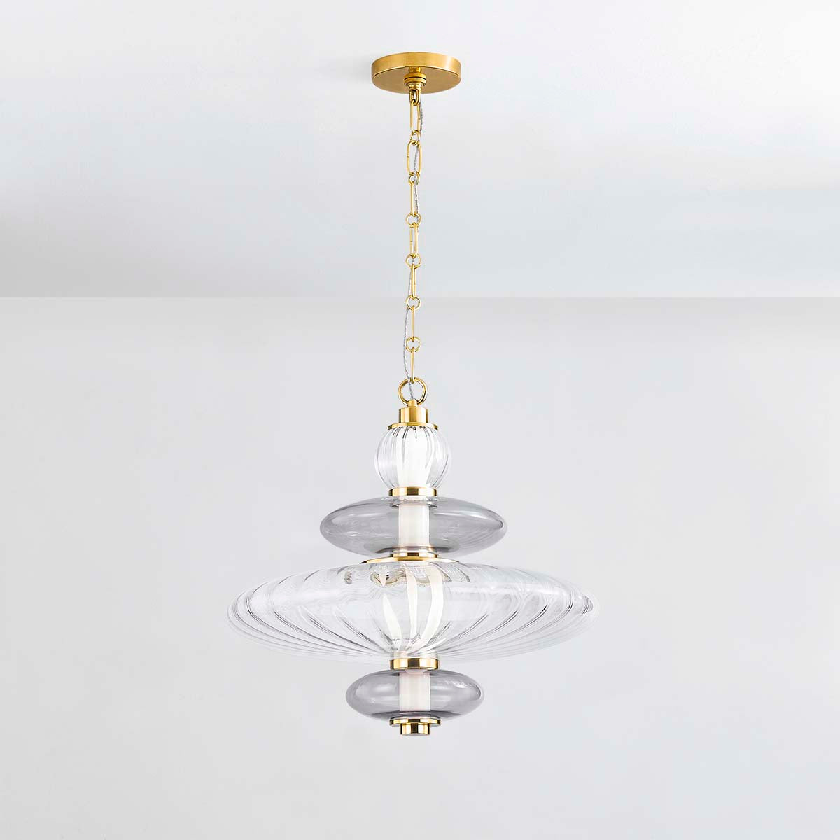 Old meets new in the nostalgic Williams pendant. Streamlined renditions of classic glass techniques are stacked to create a striking totemic composition. Alternating clear optic and smoked glass shades are stacked around a single LED tube, which serves as the core of this eye-catching fixture. Williams is available in two sizes and is finished in Aged Brass.
