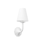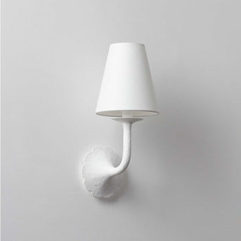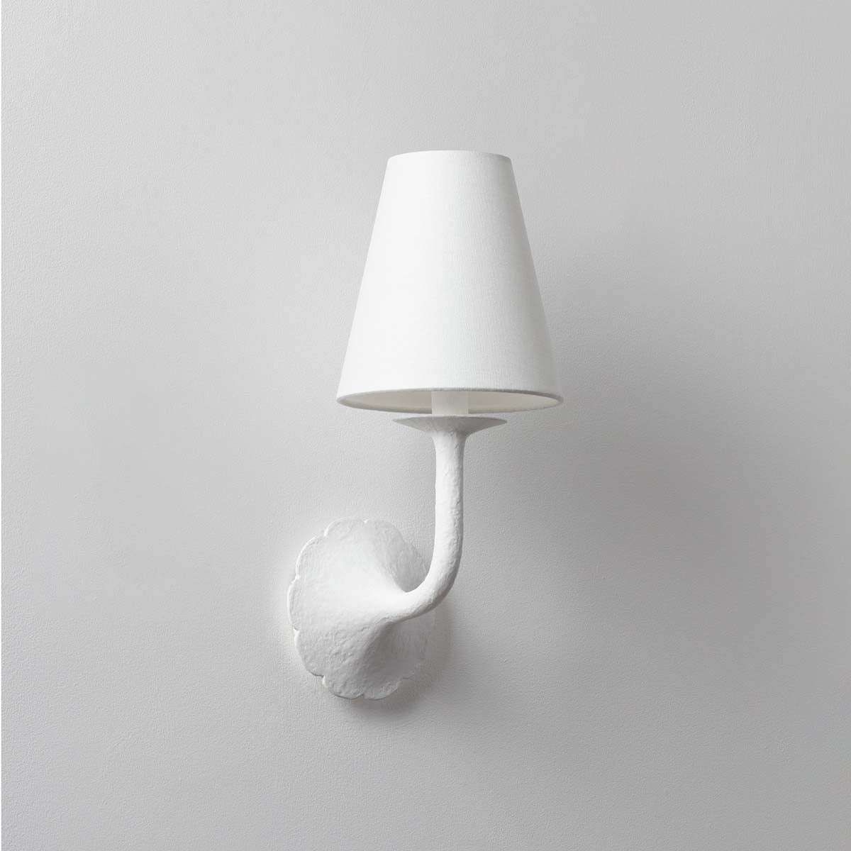 Inspired by a flower in bloom, the charming Winnipeg sconce features delicate scalloped edges and a tailored silhouette. The botanical backplate swoops elegantly upwards to cradle the light source, which glows through a tapered white linen shade. A White Plaster finish imparts a chic, contemporary feel, while the Vintage Gold Leaf is refined and classic.