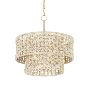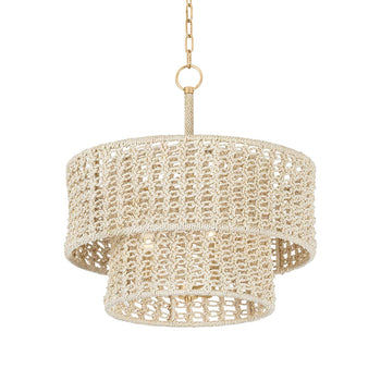 Finely handwoven from bleached abaca rope, Yorkhill channels bohemian style with its macramé-like design. This pendant lantern features a two-tier structure with classic drum shades that softly filter the light. Suspended from a Vintage Gold Leaf rod and chain, Yorkhill infuses any space with coastal, airy beauty. *Due to the one-of-a-kind nature of the medium, exact colors and patterns may vary slightly from the image shown.