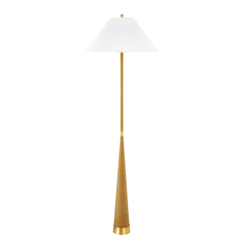 Extremely usable yet trend forward, this striking floor lamp makes a gorgeous organic statement. A slender natural raffia-wrapped stem, tapered at the bottom and straight at the top, has an Aged Brass band at the middle, creating a modern hourglass-like silhouette. A tapered white linen shade and round Aged Brass finial complete the look.