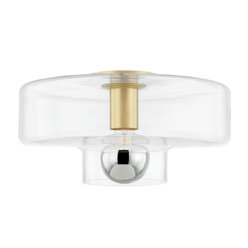 Not your grandmother's mushroom-shaped flush mount, Iona's clear glass drum shade quite literally captures the glow of the globe bulb inside. The clean, smooth design is available in Aged Brass or Polished Nickel with an incandescent or silver-tipped bulb.