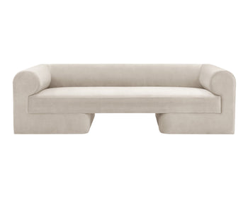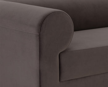 A bold take on contemporary style, this sofa will stand out in any space. Features rounded back and arm rests for ultimate comfort. Fully upholstered in luxurious meg taupe and gold fabrics. Pair with coordinating armchair to complete the look.