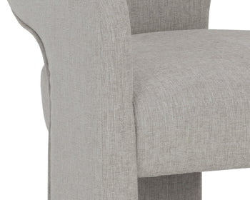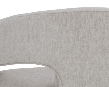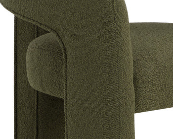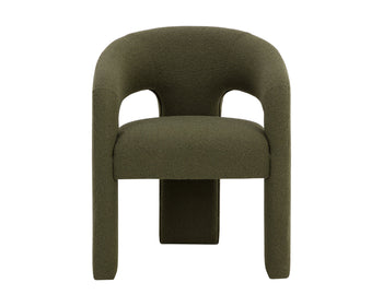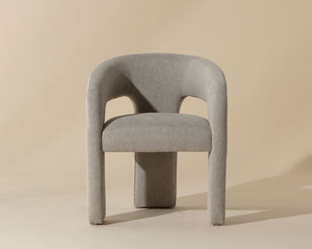 Clean lines and contoured arches add style and structure to this contemporary dining chair. Features a curved backrest and open back for optimal comfort. Eye-catching from all angles. Fully upholstered in ernst sandstone fabric.