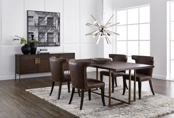 This uniquely crafted sideboard will add transitional allure to any dining space or foyer. Made from acacia wood veneer with four drawers and two large cabinets for ample storage. Alternating wood grain patterns on the drawer fronts and antique brass hardware complete the look. Suitable for residential and contract settings. As wood is an organic, porous material, these pieces will contain natural variation of texture and may also exhibit fine indentations and cracks. Wood pieces will also display a disparity of colour and grain, and visible knots and burls that add to the character of each piece.