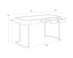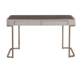 This contemporary desk is defined by its beautiful and gentle curves. Upholstered in cream faux leather with a brown oak veneer tabletop that is sure to impress. Includes two drawers and completed with a warm brass steel base.