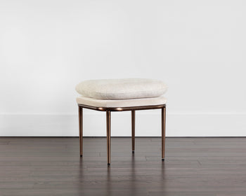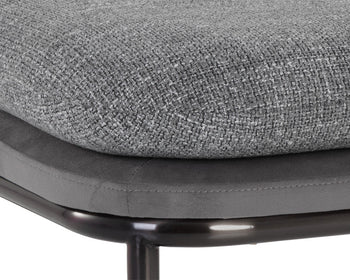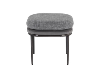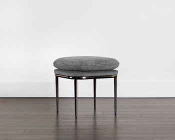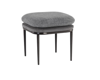 Rejuvenate any space with this contemporary stool that features a sleek design. Upholstered in chacha grey and antonio charcoal fabrics with a double cushioned seat. Completed with a gunmetal stainless steel base. Also available in a chacha cream and meg taupe fabric combination with a dark bronze stainless steel base. Coordinating bench also available.