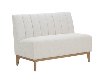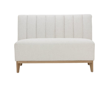 Elegantly designed, the Kosovo Banquette exudes luxe comfort. Upholstered in copenhagen white boucle fabric with vertical tufting, and completed with oak wood legs with a natural finish. As wood is an organic, porous material, these pieces will contain natural variation of texture and may also exhibit fine indentations and cracks. Wood pieces will also display a disparity of colour and grain, and visible knots and burls that add to the character of each piece.