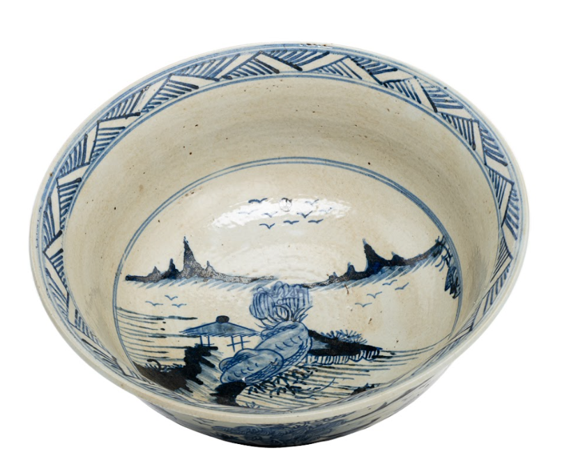 Our fabulous antiqued large landscape bowl! Perfect for showcasing as a centerpiece or displaying a potted orchid or flowers. Its versatile design boasts a lightly antiqued finish, adding a touch of heirloom beauty.