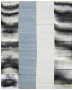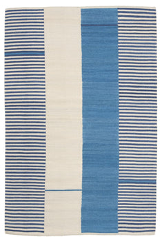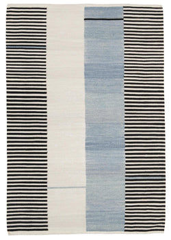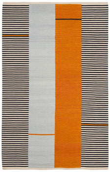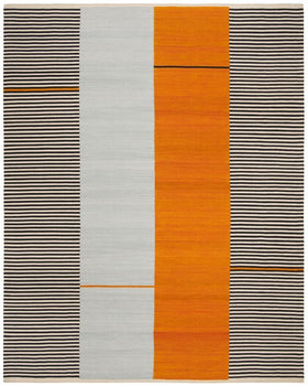 Contemporary asymmetrical design and bold, solid color statements are artfully showcased in the mod Aryn Stripe. Aryn?s block structure lends balance and distinguishing character to overall striped pattern. Classic hand woven flat weave construction using pure handspun wool.