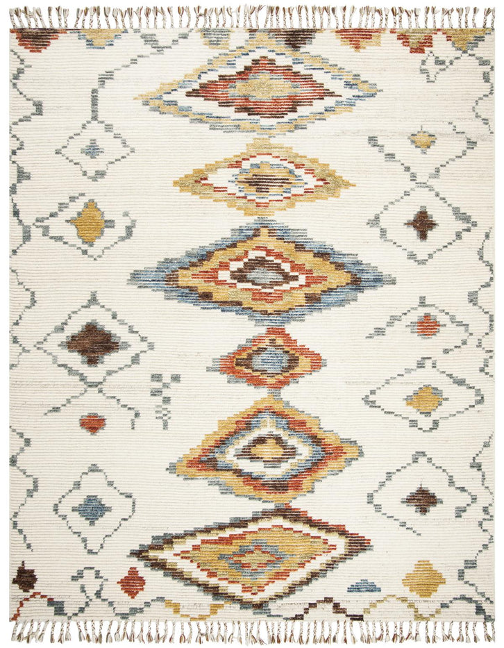 Evocative nomadic motifs are restyled for classy boho-modern decor. Long, linear shaped pile surface accentuates desert toned hues and intriguing textures. Expertly hand knotted using pure mountain wool. Elongated fringes condense Nahla?s collage of colors.