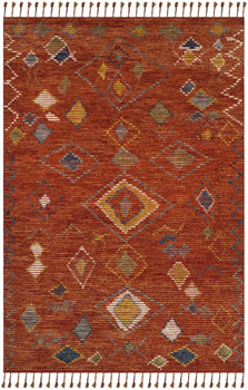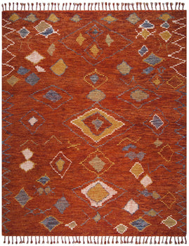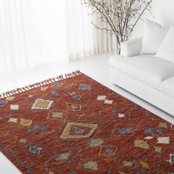 Vibrant currant and saffron hues lend contemporary radiance to Nahla?s tribal-inspired motifs. Expertly hand knotted using pure mountain wool. A linear pile and soft, pebbly finish lend a dimensional feel and appearance to compelling design and rippling texture. Long braided fringe celebrate Nahla?s collage of color.