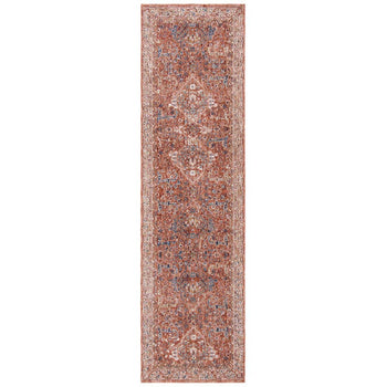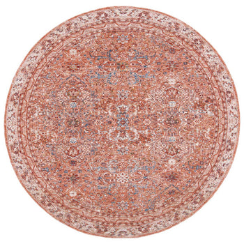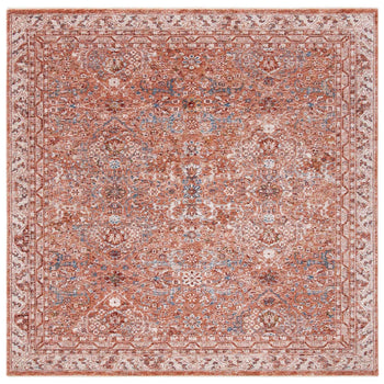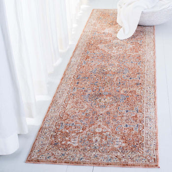 The rich burnt orange hues serve as a warm backdrop to the intricate patterns that adorn this piece, harking back to classic designs with a nod to contemporary tastes. Hints of cream and subtle blue motifs interplay across the surface, capturing the essence of an heirloom piece with the practicality of modern manufacturing.