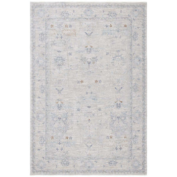 The rug's transitional style merges classic charm with modern aesthetics, making it an ideal choice for those who appreciate timeless beauty with a contemporary edge. The subtle pattern depicted in the image reveals a tasteful medley of botanical motifs, gently distressed for a heritage feel, set against a serene light grey background.