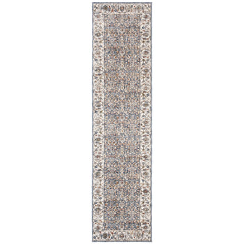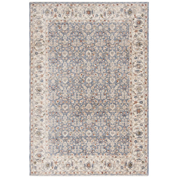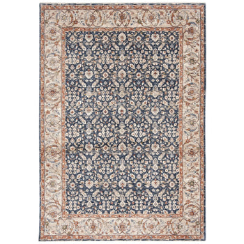 Drawing inspiration from classic designs, the rug's pattern is an intricate array of florals and ornamental motifs that bring a sense of grandeur and charm to any room. The border is accentuated with detailed floral elements, framing the central pattern beautifully.