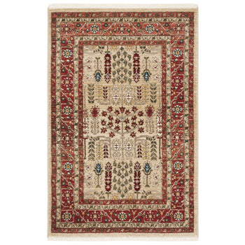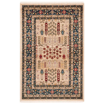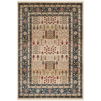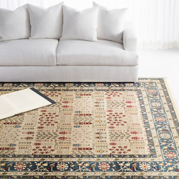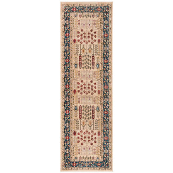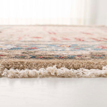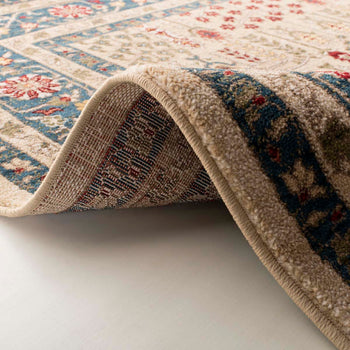 The rug exudes a classic charm with its traditional style, featuring intricate patterns in a harmonious blend of beige and navy hues, accentuated by pops of red and subtle touches of softer colors that bring a sense of warmth and sophistication to any room. Whether placed in your entryway, beside your bed, or as an accent in your living room, this rug is an effortless way to introduce a piece of cultural heritage and polished style to your interior decor.