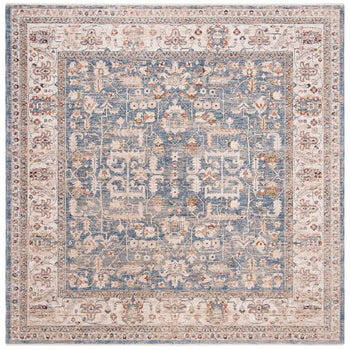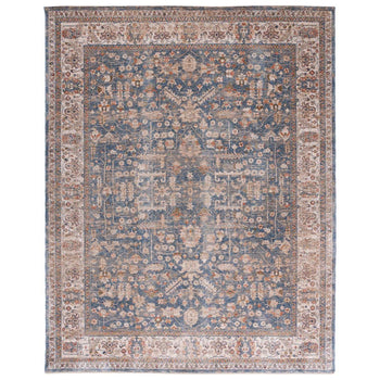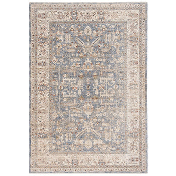 The color palette of light blue and ivory gracefully intertwines to create a serene backdrop for the intricate rug pattern captured in the image. The design showcases traditional motifs that echo the rich heritage and sophistication of classic rug artistry.