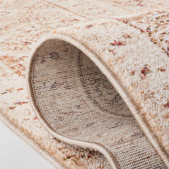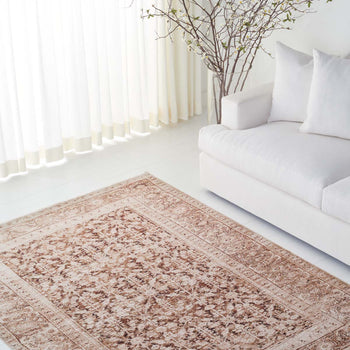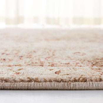 Embracing classic elegance, the rug's traditional style is accentuated by an intricate pattern that features a harmonious blend of light rust and beige hues. The design presents an opulent central motif surrounded by an elaborate border, offering an ageless appeal that complements both modern and traditional decors.