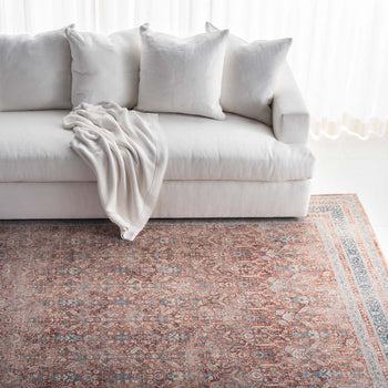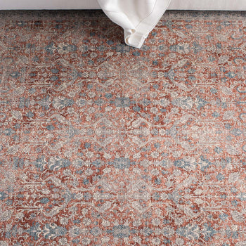 The rug exudes a rich fusion of Rust and Blue hues, which induce a warm yet vibrant ambiance that resonates with sophistication. The subtle gradations of color and intricate patterns showcase a classic design reimagined through a modern lens, making it an ideal choice for both contemporary and traditional interiors.