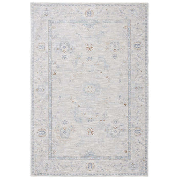 At a versatile size of 3'-3" X 5' and a comfortable height of 3/8", this subtle yet stunning piece showcases a delicate interplay of light grey tones accented with hints of serene blue and warm beige florals and traditional motifs. The timeless pattern exudes an air of classic charm with a modern twist, ideal for an array of decor styles.