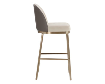 The minimalist frame of the Lavania Barstool is brought to life with an exquisite combination of two toned fabrics. Expertly upholstered with soft meg taupe fabric on the seat and interior while textured porcini taupe faux leather adds a tactile touch to the back exterior. The design is complemented with powder-coated antique brass stainless steel. Handle With Care: This design has been crafted with faux leather. Faux leather is manufactured to reflect the natural characteristics of leather; as such, colour variations, markings, wrinkles, grooves, and light scratches are appreciated characteristics. No two pieces will be alike. Visit our Product Care page for more information on how to ensure the lasting beauty of this piece.